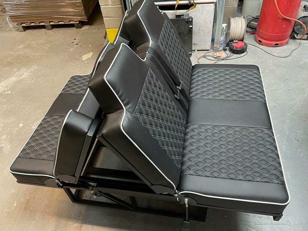 PREMIUM Rock & Roll bed with matching front 2+1 seats offered exclusively by Lusso Campers.